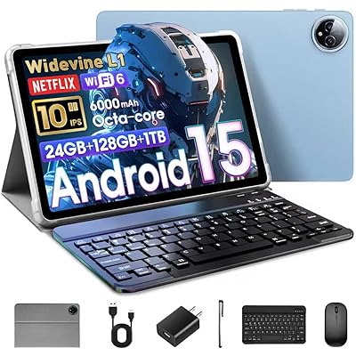 Android 15 Tablet 10 Inch, 24GB RAM+128GB ROM/1TB Expandable, 1.8GHz Octa-core CPU, 1280x800 IPS HD Display, WiFi 6, BT 5.4, 5+8MP Camera, 2 in 1 Tablets with Keyboard Case Mouse Stylus