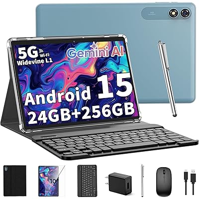 Tablet 2025 Latest Android 15 Tablets with 10.1 Inch Incell Display, 24GB RAM 256GB ROM /2TB TF, Gemini AI, T606 Octa-Core+8MP Camera, 5000mAh, Widevine L1, 2 in 1 Tablets with Keyboard Mouse Stylus