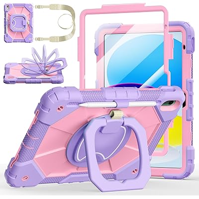 Case for iPad (A16) 11th/10th Generation 11/10.9 Inch 2025/2022, Ubearkk for iPad a16 case with Screen Protector, 360 Degree Rotating Stand Shoulder Strap Pencil Holder, Purple Pink
