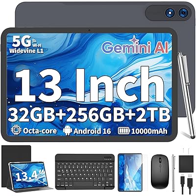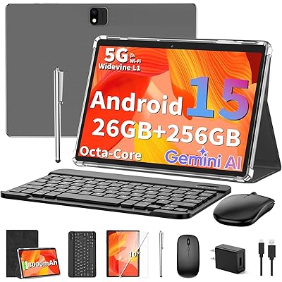 Android Tablet with Keyboard, Android 15 Tablet 10 inch, 26GB+256GB+2TB Expand, 2-in-1 Tablets with 8-Core, 5G WiFi, 8000mAh, BT5.0, GMS, GPS, Gemini AI, Tablets PC with Mouse, Case, Stylus(Black)