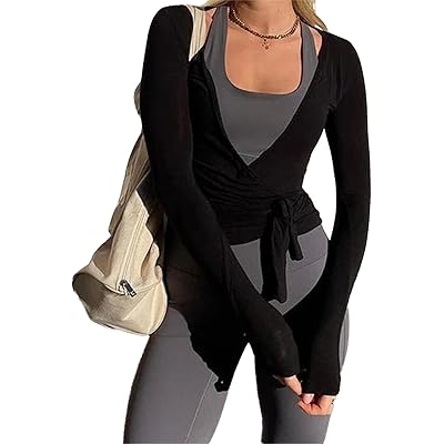 Women Wrap Tie Top Y2k Long SLeeve Ballet Workout Yoga Shirt Coquette Blouses