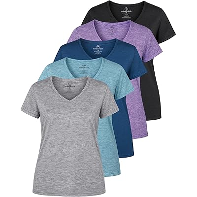 Real Essentials 5 Pack: Women's Dry Fit Short Sleeve V Neck Workout Top - Fitness Gym Athletic Yoga T-Shirt (Plus Available)