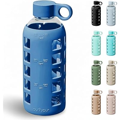 purifyou 40oz / 32oz / 22oz / 12oz Borosilicate Glass Water Bottle with Time & Volume Markers, Silicone Sleeve, Stainless Steel Lid | Reusable Glass Bottle for Water & Juice (22oz Chinese Porcelain)