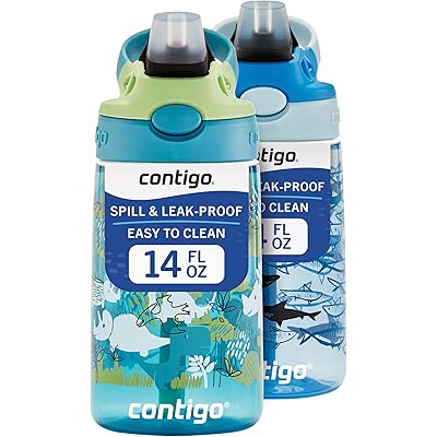Contigo Aubrey Kids Water Bottle, 2-Pack, 14oz, Dinos & Sharks, Spill-Proof Lid, Dishwasher Safe, Blue & Green