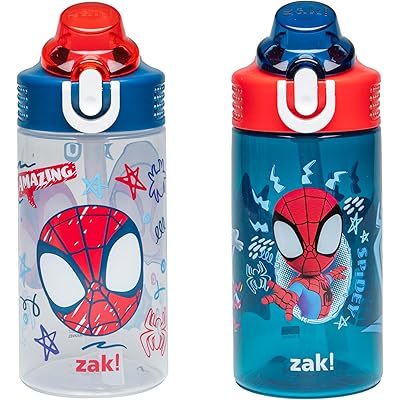 Zak Designs Marvel Spider-Man Sage Kids Water Bottle For School or Travel, 16oz Durable Plastic Water Bottle With Straw, Handle, and Leak-Proof Spout Cover, 2-Pack (Spidey and His Amazing Friends)
